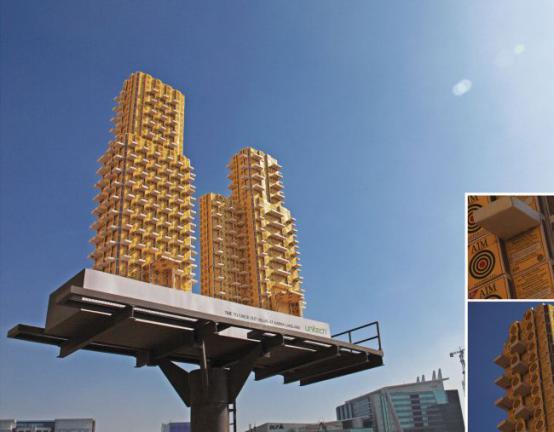 1、印度Karma Lakelands新别墅社区户外广告牌,由数百个火柴盒粘贴成社区高楼的模型,别墅区建筑外形观众一目了然。