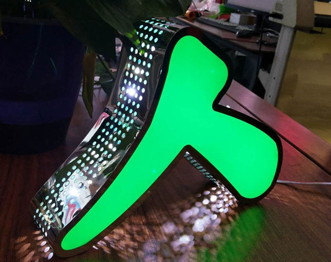 高边冲孔发光字是由高边发光字演变,是高边发光和和冲孔发光字的结合体,正面亚克力面板发光,侧边冲孔网站发光,很是奇特。不发光字是因为高边的造型和侧边网状的特点,吸引众人。正所谓广告哗众而引之。